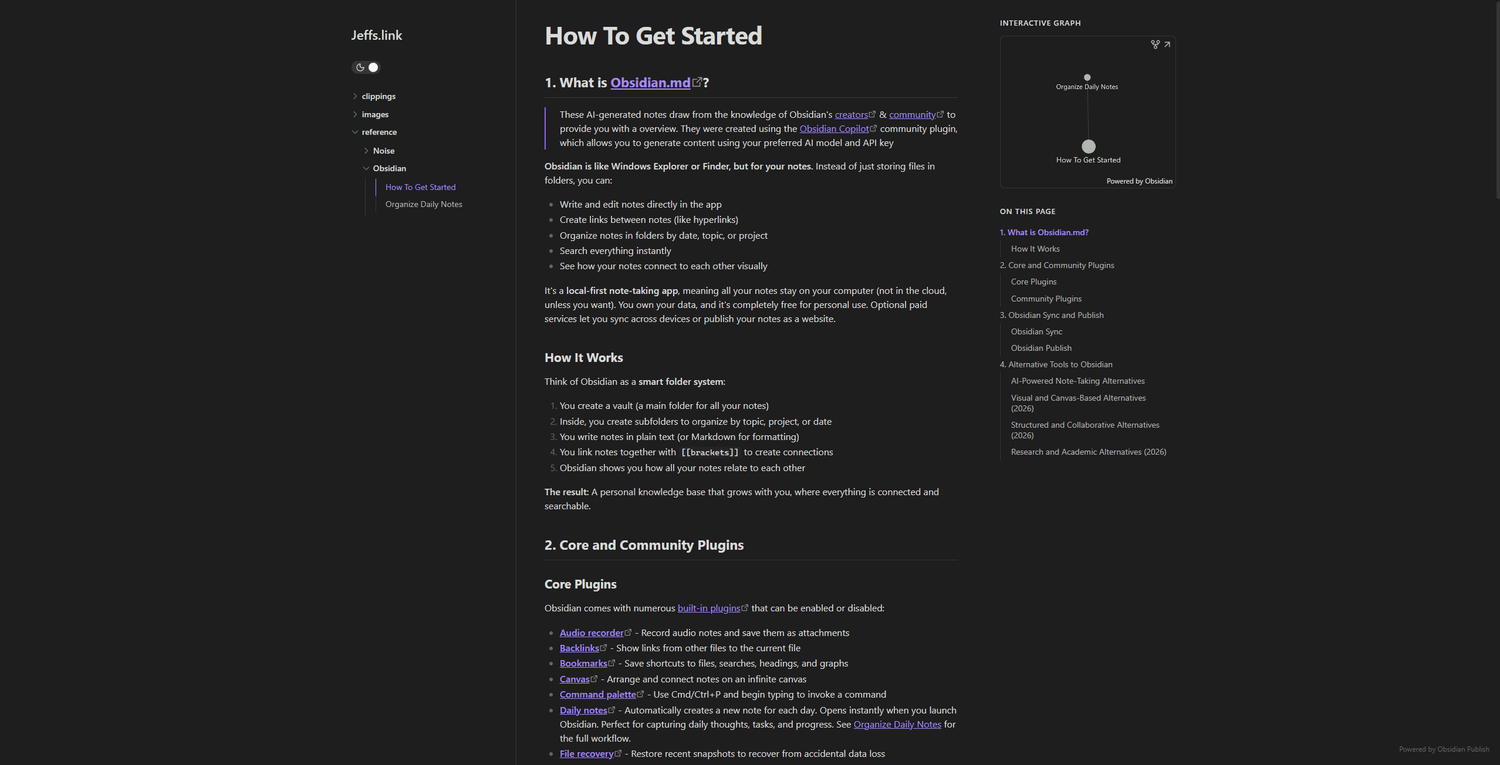 The demo: Part of my Obsidian vault is published at jeffs.link — you can explore the notes and structure there.